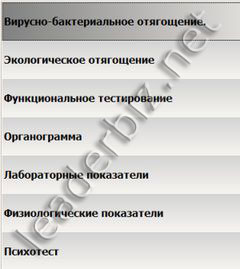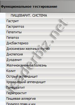 Раздел функциональное тестирование диагностического прибора Паркес "Семейный доктор" разбит по системам. В каждой системе выделены наиболее часто встречающиеся заболевания. Данный раздел позволяет дифференцировать основные патологии пищеварительной, мочевыделительной, дыхательной, сердечно-сосудистой, костно-мышечной, нервной систем, эндокринной и системы кожи, имунной системы.