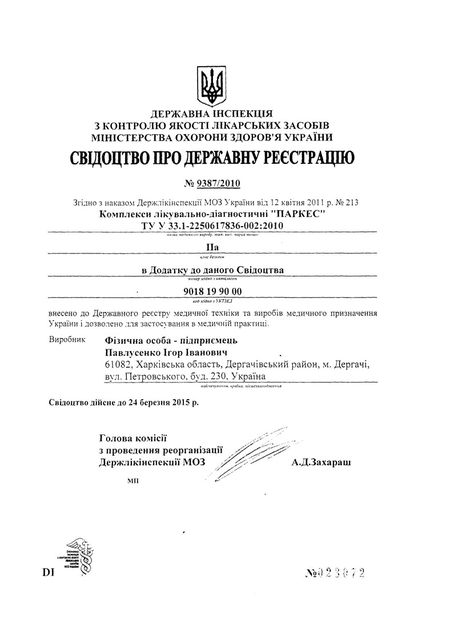 СВИДЕТЕЛЬСТВО О ГОСУДАРСТВЕННОЙ РЕГИСТРАЦИИ АНТИПАРАЗИТАРНОГО ПРИБОРА БРТ ПАРКЕС |