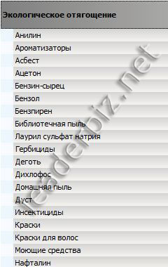 Содержит нозоды самых наиболее часто встречающихся бытовых, промышленных, производственных токсинов. Позволяет определить токсическое влияние на организм радионуклидов, солей тяжелых металлов, пестицидов, нитратов, аллергенов, моющих средств, красителей, растворителей, химических веществ используемых для обработки фруктов, овощей, мясных изделий с целью продления срока хранения.